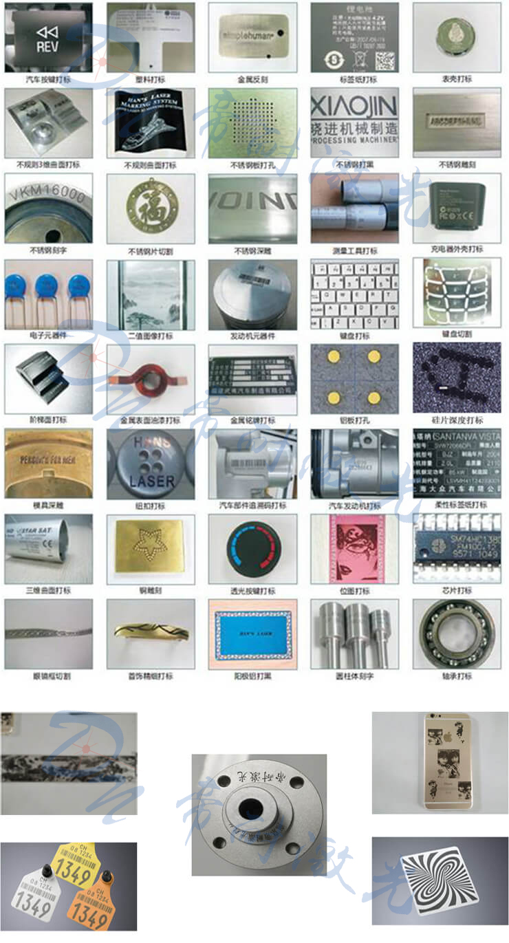 廣泛適用于集成電路芯片、電腦配件、工業軸承、鐘表、電子及通訊產品、航天航空器件、各種汽車零部件、家電、五金工具、模具、電線電纜、食品包裝、首飾、煙草以及軍工產品等眾多領域圖形和文字的標記,以及大批量生產線作業。
